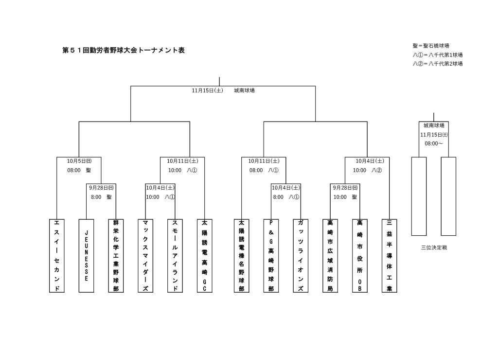 「第51回」勤労者野球大会対戦表を公開しました 2025年9月8日 最終更新日時 : 2025年9月8日 勤スポ 今年も勤労者野球大会の時期になりました。 参加チームは12組。皆様の検討をお祈りします! 第51回勤労者野球大会トーナメント表.pdf